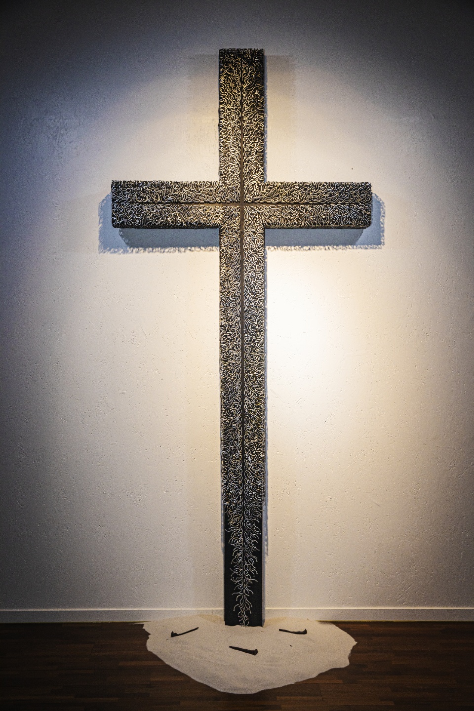 " 세걔의 대못과 만개의 못을 나무에 박아 만들어진 십자가" 2000년 전 예수는 십자가에 매달려 양손과 발에 못박혀 돌아가셨다. 양손과 발에 박힌 못은 우리 삶의 고통을 의미한다. 부활을 통해 세 개의 못에서 해방된 예수님. 2000년 전의 역사를 이야기하며 작가는 . . .