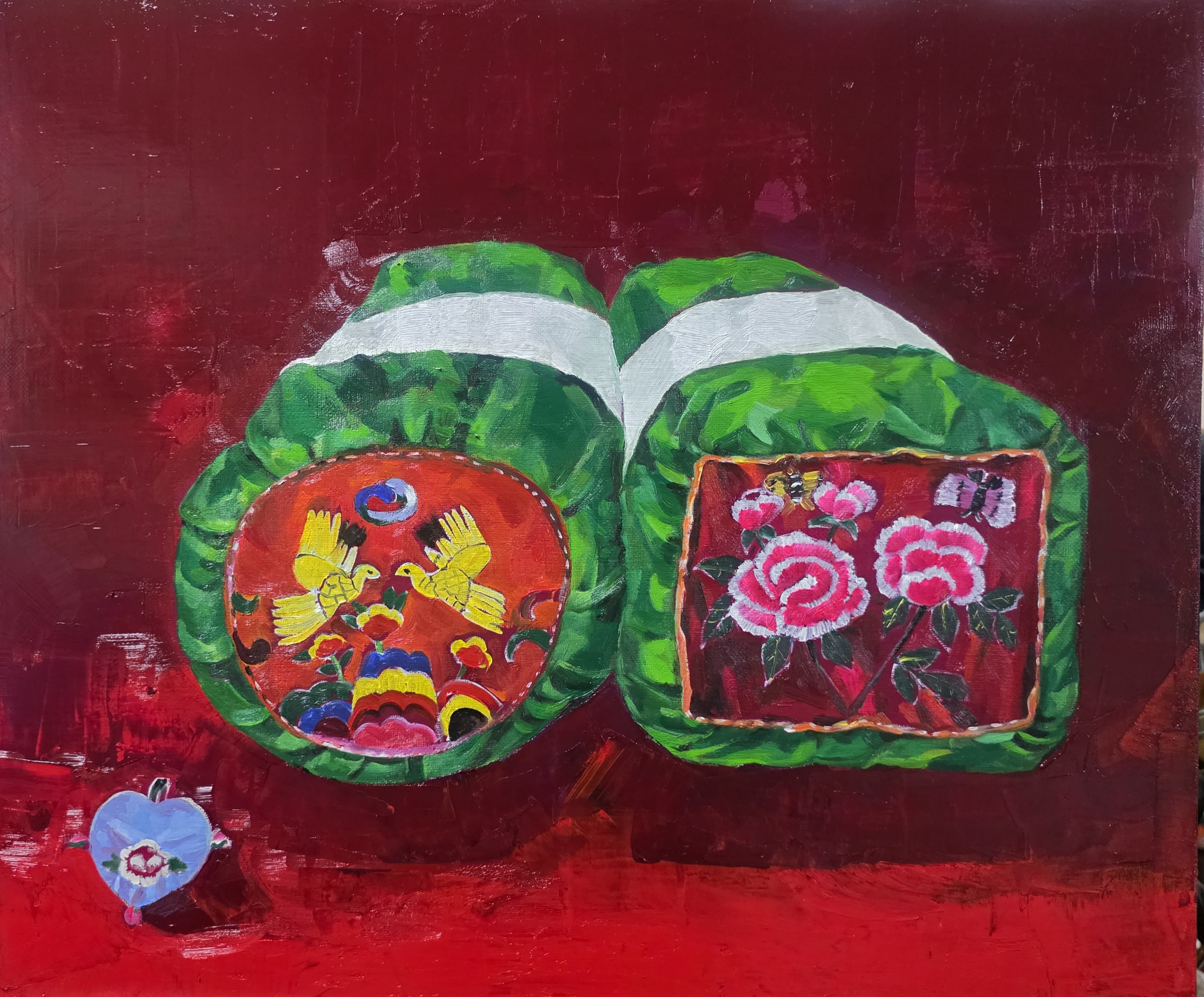 박정란 베갯모 한국전통 베갯모(베개 양쪽장식 꾸밈)를 현대적으로 재해석한 회화 작품입니다. 깊은 진홍색 배경은 따뜻하고 은밀한 안방의 분위기를 불러일으키며 베갯모를 감싸는 풍성한 에메랄드빛 초록천과 아름다운 대비를 이루고 있습니다. 각 베갯모에는 부귀영화, 다 . . .