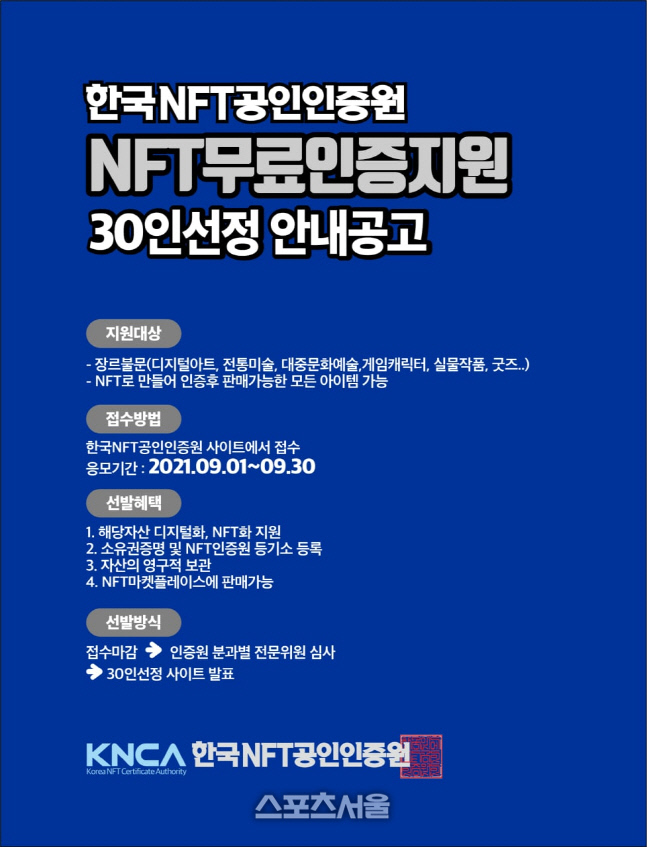 [스포츠서울 | 이환범기자] 한국NFT공인인증원(KNCA)이 NFT 생태계 활성화를 위한 무료 NFT 등록 및 인증 지원을 진행한다.