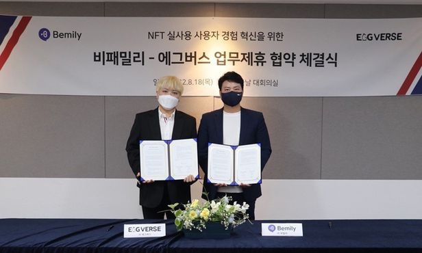 NFT 거래소 에그버스는 지난 18일 비패밀리와 전략적 업무협약(MOU)을 체결하고 모바일 메신저에서 NFT를 활용하는 서비스를 개발한다고 밝혔다. 에그버스는 지난 3월 서비스를 시작한 국내 NFT 거래소이고, 비패밀리는 다날의 계열사인 비밀리가 운영하는 사생활 보호용 메신저 앱이다.