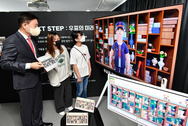 22일 서울 중구 우표박물관에서 열린 '2022 대한민국 우표전시회'에서 손승현 우정사업본부장으로부터 우표전시회 수상 어린이들이 우표 원화를 재해석한 NFT(대체불가토큰)에 대해 설명을 듣고 있다.