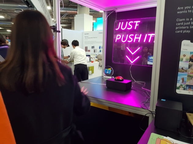 핫핑크 색의 네온 글씨 아래 빨간 버튼을 누르자 작은 카메라가 반짝이며 즉석사진이 찍혔다. 10초 정도 흐르니 옆에 놓인 작은 기기에선 '클램(CLAM)'이란 글자와 함께 QR코드가 찍힌 녹색 영수증이 출력됐다. 클램은 루트라가 개발한 포토카드 NFT 제작 서비스의 이름이다. 선종엽 루트라 대표는 "NFT 영수증"이라며 "만질 수 없는 NFT에 실물 경험을 입히니 사람들의 반응이 좋다"고 했다.