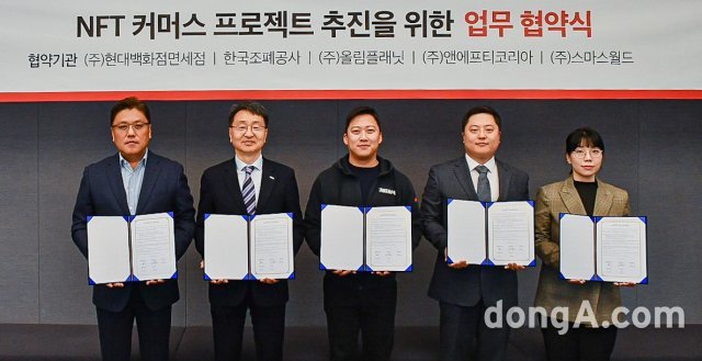 현대백화점면세점은 서울 삼성동 파르나스타워 올림플래닛 본사에서 한국조폐공사, 스마스월드, 올림플래닛, 앤에프티코리아와 함께 NFT 아트 작품 제작·유통 협력 ‘NFT 커머스 프로젝트 추진을 위한 다자간 업무협약’을 체결했다고 10일 밝혔다.